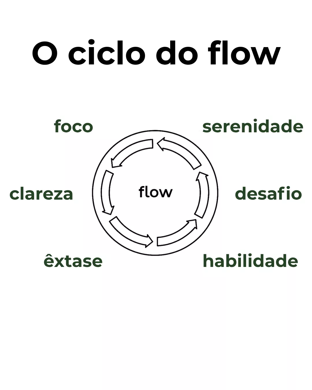 Tudo começa com foco. Selecionando exatamente o que você tem que fazer. A partir dessa decisão, você ganha clareza — clareza de onde você pode chegar, clareza do que você precisa fazer. A partir disso, vem o êxtase. Em outras palavras, você fica completamente envolvido e empolgado com o que está fazendo. Isso se conecta com a habilidade que você tem para desempenhar tal tarefa. É com essa habilidade que você enfrenta o desafio que está bem na sua frente — com regras e metas claras. O resultado disso, é uma serenidade absurda. Uma paz interna quase inexplicável que surge como uma alquimia de neurotransmissores — dopamina, serotonina, oxitocina e outros.